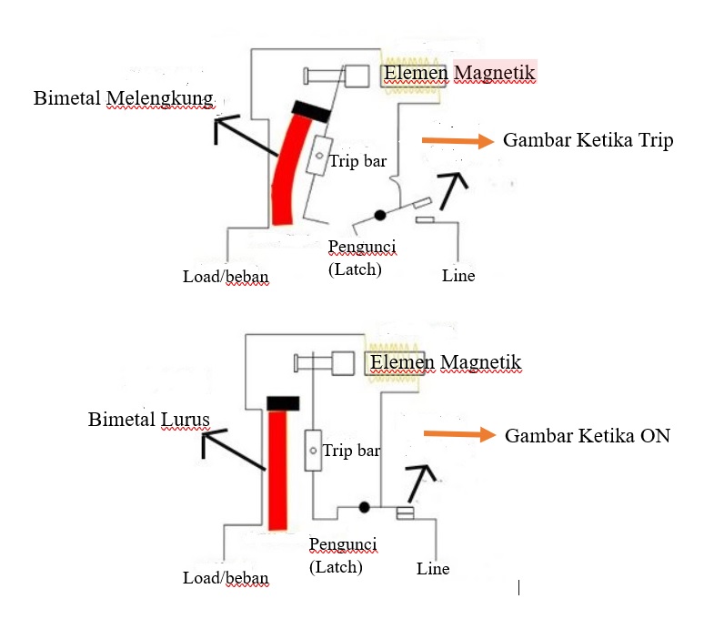 Ketika dalam kondisi suhu normal, arus listrik akan melewati MCCB melalui kontak bimetal tersebut. Akan tetapi, jika arusnya melebihi dari kemampuan (kapasitas) yang ditentukan, maka kontak yang berbahan bimetal ini suhunya menjadi panas dan melengkung. Sehingga, tuas operating akan tertekan sehingga membuat arus listrik terputus.
