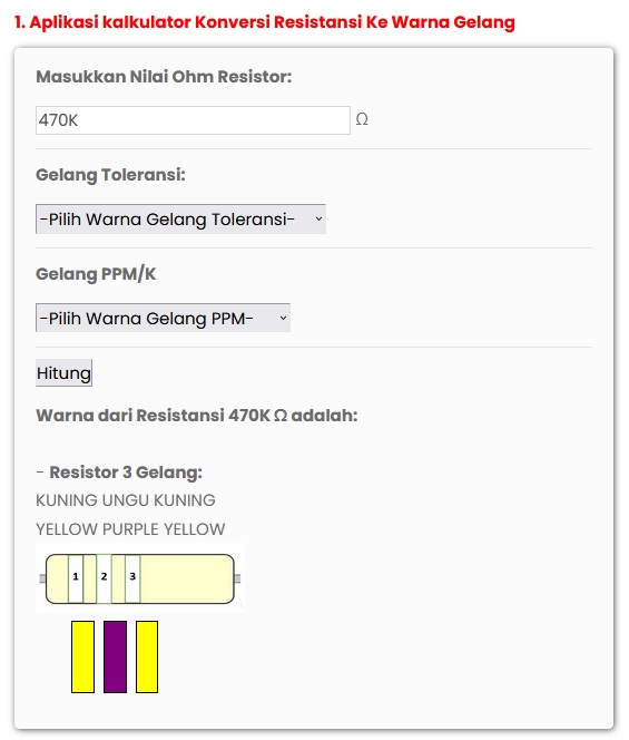 Adapun hasil kode warna 470K yang telah dilakukan kalkulator resistor adalah Kuning Ungu Kuning. Jadi dapat ditarik kesimpulan bahwa kode warna gelang resistor 470k yang kita cari secara manual hasilnya telah sama dengan hasil dari kalkulasi kalkulator resistor yaitu warna Kuning Ungu Kuning.
