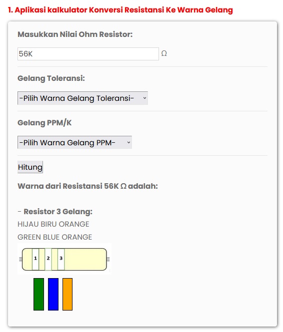 Kemudian kita lakukan pengujian apakah penentuan warna resistor tersebut secara manual sudah benar hasilnya dengan menggunakan kalkulator resistor. Berikut gambar di bawah merupakan hasil penggunaan dari kalkulator resistor.