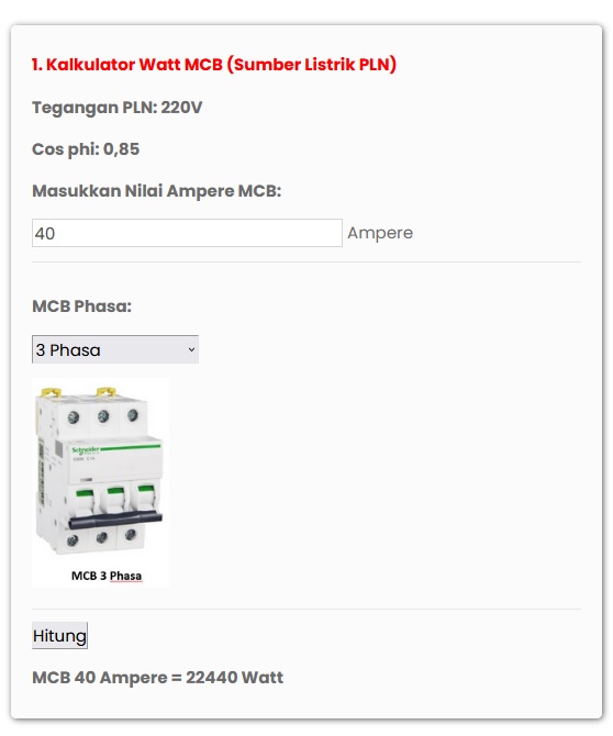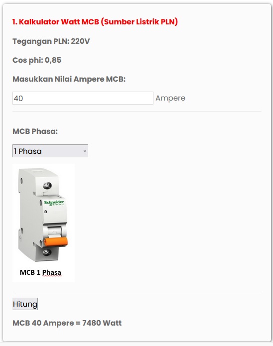 Kita mulai dengan MCB 40 Ampere 1 Phase Berapa Watt. Ada 2 cara yang dapat kita lakukan untuk mendapatkan nilai watt dari ampere MCB. Jadi caranya adalah dengan menggunakan rumus daya listrik atau dapat dilakukan dengan cara menggunakan kalkulator watt MCB. Di mana kalkulatornya? Tenang saja, birolistrikdotcom sudah menyediakan kalkulator online berbasis web yang dapat anda gunakan secara gratis tanpa menginstall kalkulator tersebut di gadget anda.