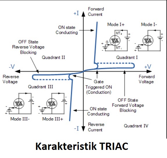 Perhatikan gambar karakteristik TRIAC, pada kuadran Ι di mana tegangan positif +V dan arus positif +I (sumbu x dan y), TRIAC biasanya ditrigger menjadi konduksi (ON) oleh arus gerbang yang bernilai positif, dengan label di atas gambar rangkaian sebagai mode Ι+. Tetapi itu juga bisa ditrigger oleh arus gerbang negatif, dengan mode Ι–.