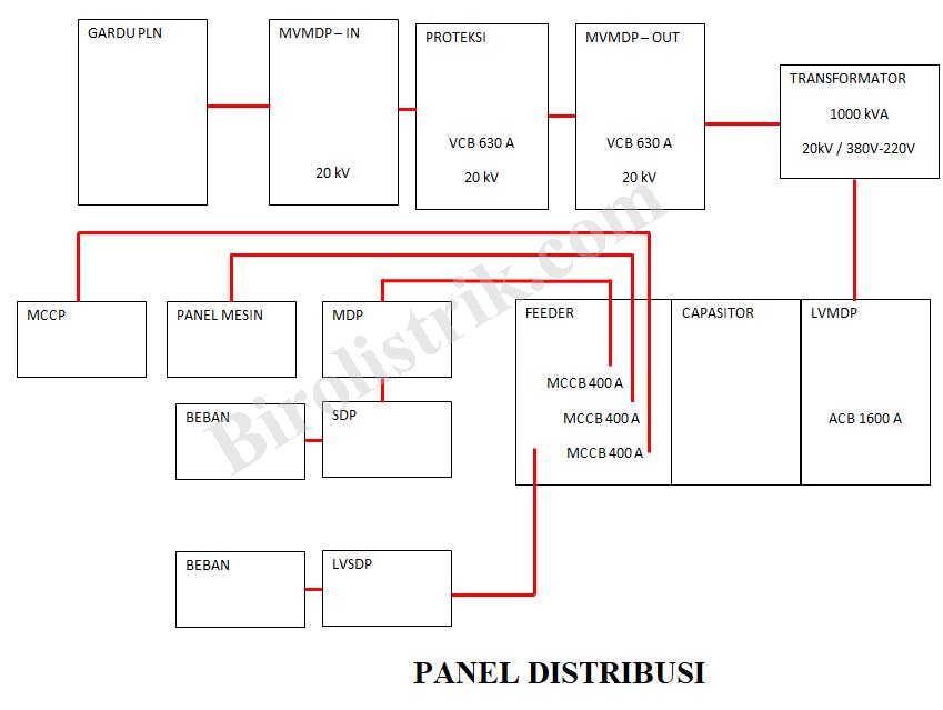 - Setelah melewati sistem proteksi, daya listrik disalurkan melalui busbar ke berbagai panel distribusi sekunder (SDP, atau langsung ke beban).