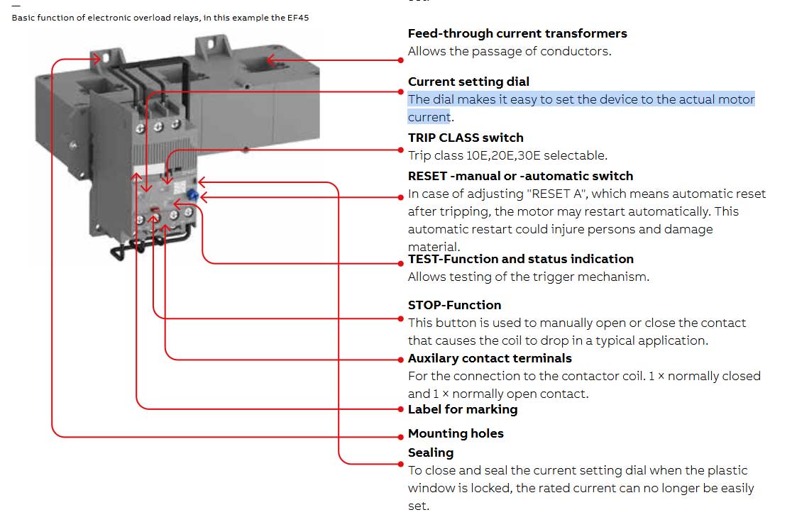 Current setting (ampere) adalah saklar putar yang berguna untuk memilih besaran setting batasan arus listrik saat terjadi overload. Besarnya setting arus listrik adalah arus listrik dari motor yang terpasang pada TOR. Beberapa produsen TOR mengharuskan untuk setting arusnya sebesar 125% dari arus beban penuh, namun ada beberapa produsen tor yang hanya mengharuskan kita mengatur setting arus sebesar arus beban penuh motor yang terpasang. Contoh besarnya setting arus sesuai pada arus motor beban penuh yang terpasang pada TOR disebutkan pada datasheet dari TOR tersebut seperti berikut: