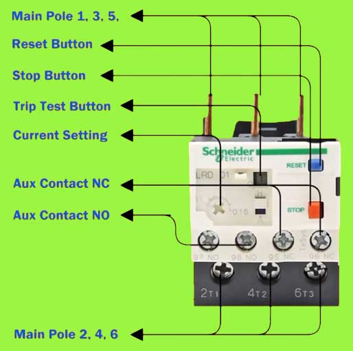 Tiap bagian-bagian pada sebuah thermal overload relay (TOR) berbeda-beda, tergantung dari perusahaan yang memproduksi dan tipe TOR tersebut. Contohnya antara TOR produk dari schneider dan ABB, keduanya memiliki letak yang berbeda tombol reset dan test. Pada gambar di bawah adalah bagian-bagian TOR dari schneider yang mana fungsi dan bagian-bagian tersebut sebagai berikut: